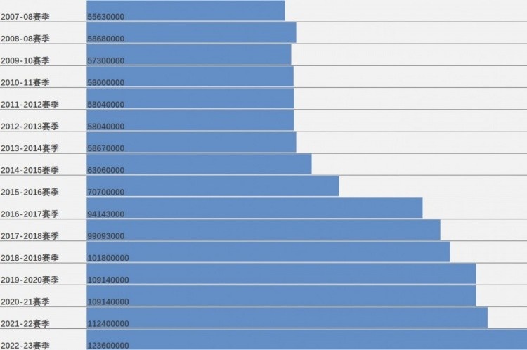 NBA工资帽的数额,简单来说就是和BRI(篮球相关收入)挂钩。NBA的蛋糕做大了,球员们的收入也跟着提高。十年来NBA的工资帽每年都在上涨,近几年的上涨幅度尤为夸张。