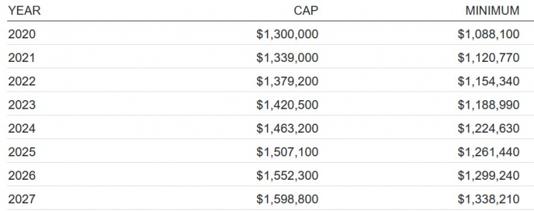 2023-24赛季,NBA的工资帽预计有1.34亿美元。近十年来工资帽一直在飞涨,NBA已经进入亿元合同满天飞的时代。去年7月1日,NBA自由市场开启,一瞬间天文数字满天飞,令人望洋兴叹。史上仅有的两个2.5亿先生诞生:约基奇5年2.56亿,比尔5年2.51亿。除此之外还有唐斯4年2.24亿,布克4年2.14亿,拉文5年2.152亿,莫兰特和锡安5年1.93亿。