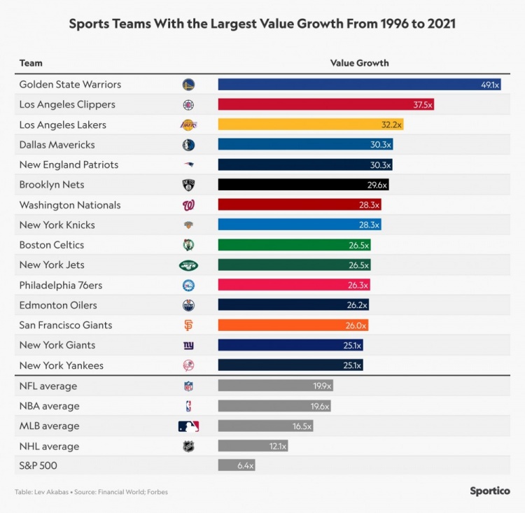 1996年至2021年,勇士市值暴涨49.1倍,快船37.5倍,湖人32.2倍,独行侠30.3倍。