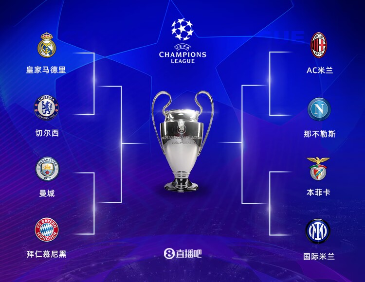 3月17日讯 欧冠1/4决赛对阵出炉,具体对阵为:皇马vs切尔西,本菲卡vs国米,曼城vs拜仁,AC米兰vs那不勒斯。