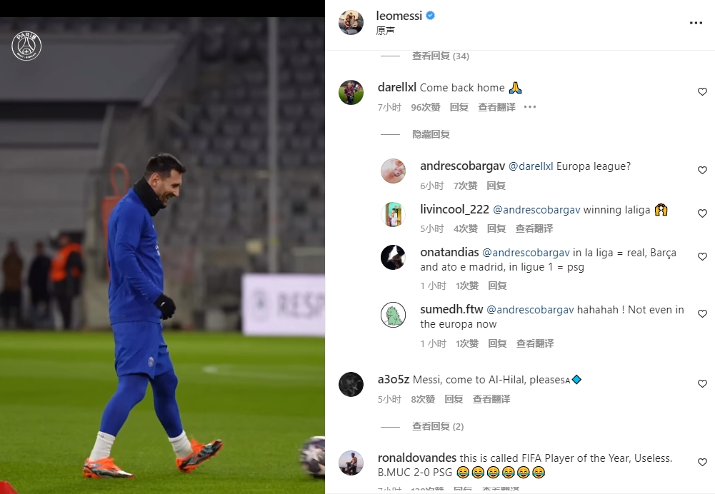 巴黎在欧冠1/8决赛次回合0-2不敌拜仁,总比分0-3惨遭出局。赛后,不少网友来到梅西ins刷屏留言。
