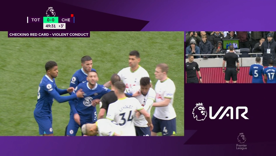 2月26日讯 热刺vs切尔西,上半场补时阶段,齐耶赫和埃默森爆发冲突,齐耶赫回击时推搡打脸埃默森。主裁判一开始无表示,随后向齐耶赫出示红牌,VAR介入后裁判改判为黄牌。