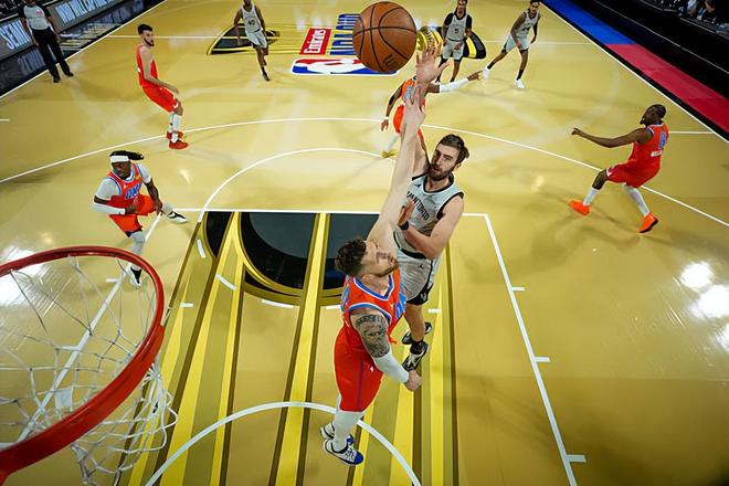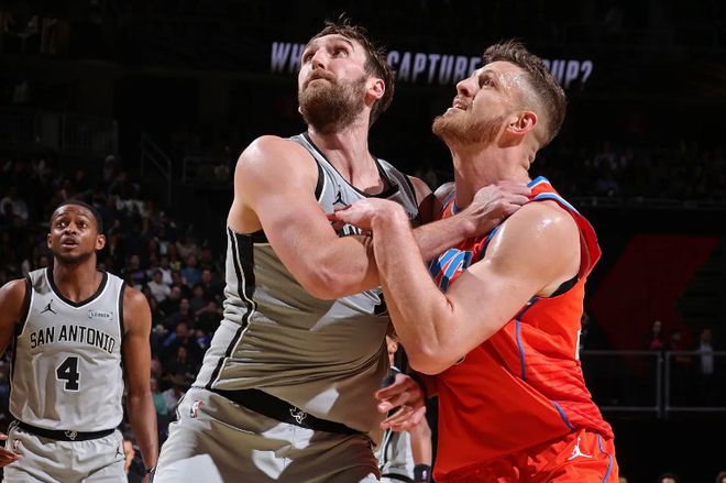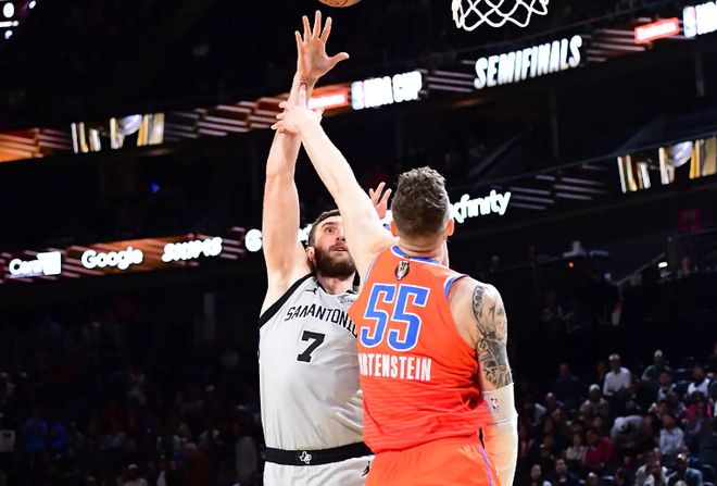 在此前的一场NBA杯西部决赛中,圣安东尼奥马刺经过苦战后以111比109险胜了主场作战的俄克拉荷马城雷霆,顺利挺进NBA杯决赛。接下来他们将会与战胜了奥兰多魔术的纽约尼克斯争夺NBA杯冠军,而雷霆则是遭遇淘汰。本场比赛后,拿下了3连胜的马刺的战绩提升到了18胜7负,排名也是攀升到了西部第4位;而结束了16连胜的雷霆的战绩则是下滑到了24胜2负,排名继续稳居西部榜首位置。本场比赛中,马刺虽然拿下了比赛的胜利,但是球队的先发中锋卢克-科内特(Luke Kornet)的表现其实是非常糟糕的。科内特全场出场24分21秒,投篮3中1,得到了2分8篮板1助攻1抢断的数据,其中还包括了5个前场篮板,还有1次犯规,正负值为-15。科内特在进攻端的效率非常一般,他的得分能力并不理想,他也很难在对手内线制造基本的威胁。科内特抢下了一些前场篮板,但是他也没有办法将这些前场篮板转化成有效进攻。事实上,科内特在防守端的表现也是糟糕透顶的,他也同样没有办法发挥出自己在防守端的作用,而且可以说他是被切特-霍姆格伦(Chet Holmgren)各种打爆。作为球队的先发中锋,这样的表现显然是令人非常失望的。在上赛季的NBA常规赛中,科内特在82场比赛中总共代表老东家波士顿凯尔特人出场73次,场均出场时间达到了18.6分钟,场均数据为6分5.3篮板1.6助攻0.5抢断1盖帽,还有0.4次失误和1.6次犯规,投篮命中率66.8%,罚球命中率69.1%。到了季后赛,科内特总共出场11次,场均出场时间达到了16.4分钟,场均数据为4.5分3.9篮板0.5助攻0.5抢断1.2盖帽,还有0.5次失误和1.8次犯规,投篮命中率72.4%,罚球命中率100%。本赛季开季至今,科内特在前25场比赛中总共出场12次,场均出场时间达到了25.4分钟,场均数据为7.4分6.4篮板2.2助攻0.3抢断1.4盖帽,还有0.6次失误和2次犯规,投篮命中率62.2%,罚球命中率80.5%。其实科内特在之前一系列场次比赛中的表现还是不错的,他在进攻端有着还算不错的进攻效率,他也具备一定的传球能力和策应能力,他在防守端也能够提供一些护筐方面的支持。在维克托-文班亚马(Victor Wembanyama)缺阵的情况下,科内特也是很好地起到了自己的作用,他也为球队这段时间的稳定战绩做出了不小的贡献。如今随着文班亚马的复出,科内特在球队中的地位也会有所下降,这对于球队来说也是一件好事情。在第二阵容中,科内特的作用可能也会更加突出,他也不会打得这么吃力了。